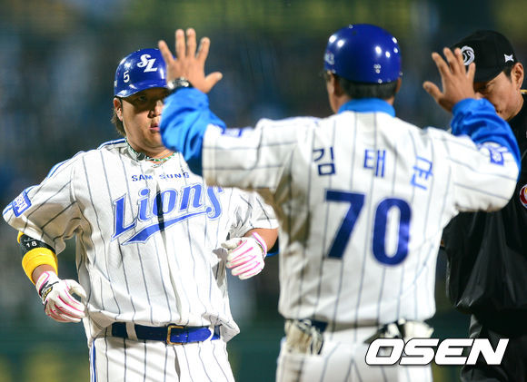 24일 오후 대구구장에서 열린 '2013 한국야쿠르트 세븐 프로야구' 한국시리즈 삼성 라이온즈와 두산 베어스의 1차전, 1회말 2사에서 삼성 박석민이 선제 솔로포를 날리고 홈을 밟으며 김태균 코치와 하이파이브를 하고 있다.