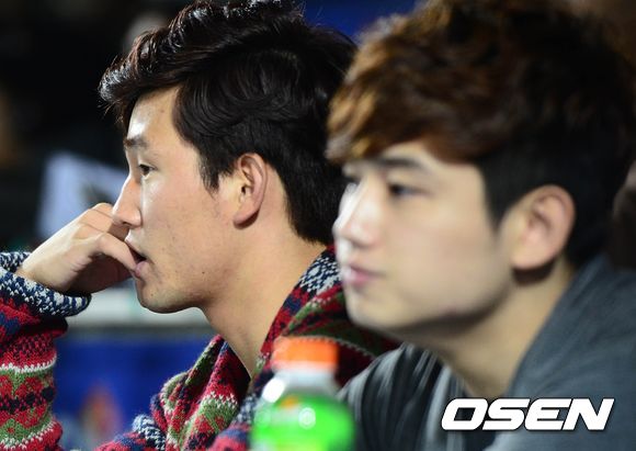 24일 오후 대구구장에서 열린 '2013 한국야쿠르트 세븐 프로야구' 한국시리즈 삼성 라이온즈와 두산 베어스의 1차전, 부상으로 한국시리즈에 출전하지 못한 삼성 김상수가 동생 김상우와 함께 경기장을 찾아 선수들의 플레이를 지켜보고 있다.