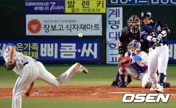 24일 오후 대구구장에서 열린 '2013 한국야쿠르트 세븐 프로야구' 한국시리즈 1차전 삼성 라이온즈와 두산 베어스의 경기 2회초 2사 1,2루 최재훈이 1타점 적시타를 치고 있다.