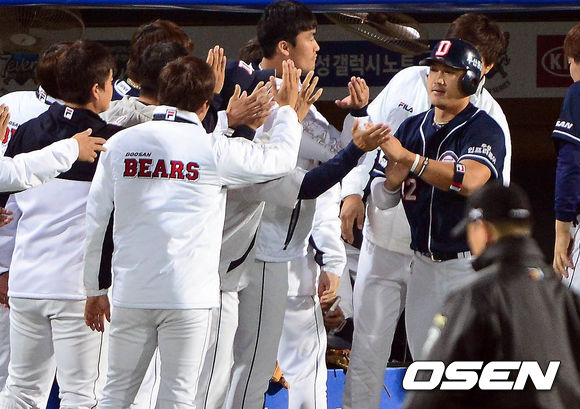 24일 오후 대구구장에서 열린 '2013 한국야쿠르트 세븐 프로야구' 한국시리즈 1차전 삼성 라이온즈와 두산 베어스의 경기 2회초 2사 1,2루 최재훈의 1타점 적시타에 홈을 밟은 2루주자 홍성흔이 덕아웃에서 동료들과 하이파이브를 하고 있다.