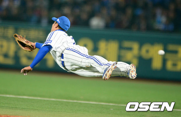 24일 오후 대구구장에서 열린 '2013 한국야쿠르트 세븐 프로야구' 한국시리즈 삼성 라이온즈와 두산 베어스의 1차전, 2회초 2사 1,2루에서 두산 이종욱의 1타점 우전 적시타에 삼성 채태인이 몸을 날렸지만 아쉽게 놓치고 있다.