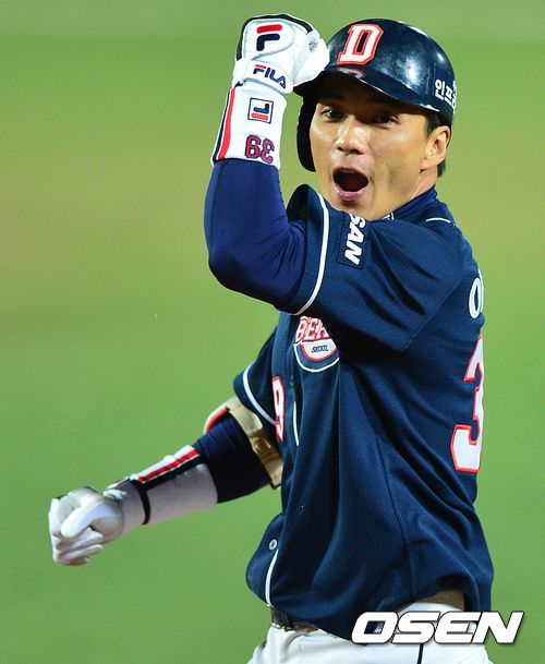 24일 오후 대구구장에서 열린 '2013 한국야쿠르트 세븐 프로야구' 한국시리즈 삼성 라이온즈와 두산 베어스의 1차전, 2회초 두산 공격 2사 1, 3루 상황 1번 이종욱이 1타점 우전안타를 날리고 1루에 안착해 환호하고 있다.