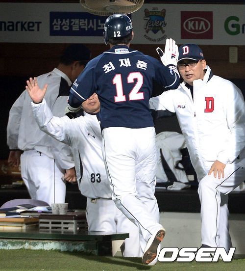 24일 오후 대구구장에서 열리는 '2013 한국야쿠르트 세븐 프로야구' 한국시리즈 삼성 라이온즈와 두산 베어스의 1차전 경기 2회초 ㅈ사 1,3루 이종욱의 안타때 홈을 밟은 최재훈을 김진욱 감독이 반갑게 맞이하고 있다.
