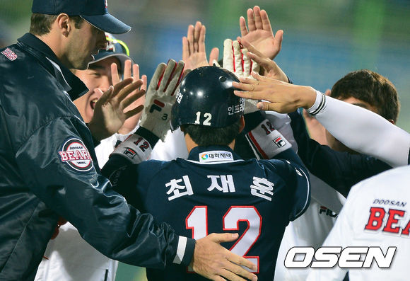 24일 오후 대구구장에서 열린 '2013 한국야쿠르트 세븐 프로야구' 한국시리즈 삼성 라이온즈와 두산 베어스의 1차전, 2회초 2사 1,2루에서 두산 이종욱의 1타점 우전 적시타에 동점타의 주인공 최재훈이 홈을 밟고 더그아웃에서 동료선수들과 하이파이브를 하고 있다.