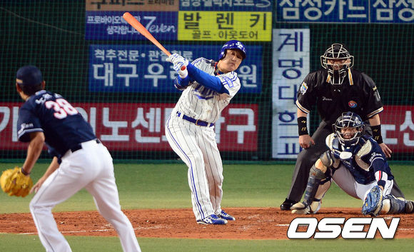 24일 오후 대구구장에서 열린 '2013 한국야쿠르트 세븐 프로야구' 한국시리즈 1차전 삼성 라이온즈와 두산 베어스의 경기 2회말 1사 이승엽이 헛스윙 삼진을 당하고 있다.