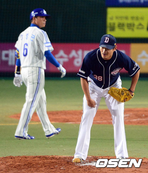 24일 오후 대구구장에서 열린 '2013 한국야쿠르트 세븐 프로야구' 한국시리즈 1차전 삼성 라이온즈와 두산 베어스의 경기 2회말 2사 1,2루 정병곤의 홈런성 파울타구에 노경은이 안도의 표정을 짓고 있다.