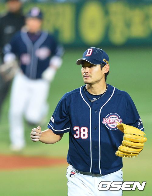 24일 오후 대구구장에서 열린 '2013 한국야쿠르트 세븐 프로야구' 한국시리즈 삼성 라이온즈와 두산 베어스의 1차전, 2회말 삼성 공격 2사 1, 2루 상황 9번 정병곤을 삼진으로 이끌며 무실점으로 이닝을 마친 두산 선발 노경은이 더그아웃으로 들어오고 있다.