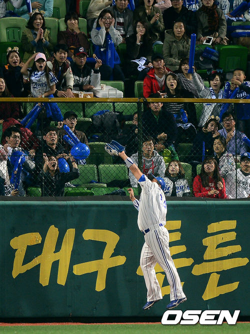 24일 오후 대구구장에서 열린 '2013 한국야쿠르트 세븐 프로야구' 한국시리즈 삼성 라이온즈와 두산 베어스의 1차전, 3회초 무사에서 삼성 최형우가 두산 김현수의 홈런성 타구를 점프해 잡아내고 있다.