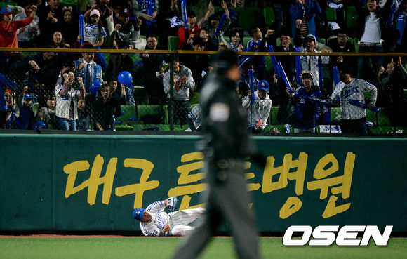 24일 오후 대구구장에서 열린 '2013 한국야쿠르트 세븐 프로야구' 한국시리즈 삼성 라이온즈와 두산 베어스의 1차전, 3회초 무사에서 삼성 최형우가 두산 김현수의 홈런성 타구를 점프해 잡아내고 있다.