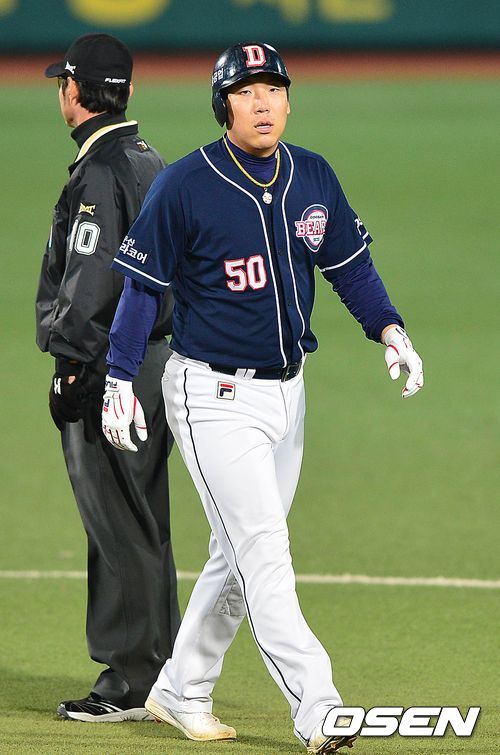 24일 오후 대구구장에서 열린 '2013 한국야쿠르트 세븐 프로야구' 한국시리즈 삼성 라이온즈와 두산 베어스의 1차전, 3회초 두산 공격 선두타자로 나선 3번 김현수가 좌측 펜스로 향하는 타구를 날렸으나 삼성 좌익수 최형우의 호수비로 아웃이 됐다. 아쉬운 표정으로 더그아웃으로 돌아가는 김현수.