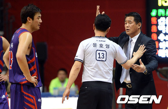 24일 오후 고양실내체육관에서 열린 '2013-2014 KB국민카드 프로농구' 고양 오리온스와 서울 SK의 경기 1쿼터 오리온스 추일승 감독이 김동욱의 노 파울선언에 대해 항의하고 있다.