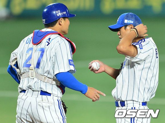24일 오후 대구구장에서 열린 '2013 한국야쿠르트 세븐 프로야구' 한국시리즈 삼성 라이온즈와 두산 베어스의 1차전, 4회초 두산 공격 2사에서 최재훈-이종욱에게 연속 안타를 허용한 삼성 선발 윤성환이 마운드에 오른 포수 이정식과 대화를 나누고 있다.