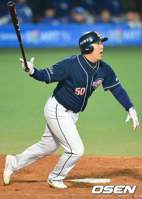 24일 오후 대구구장에서 열린 '2013 한국야쿠르트 세븐 프로야구' 한국시리즈 삼성 라이온즈와 두산 베어스의 1차전, 5회초 두산 공격 1사 주자없는 상황 3번 김현수가 우월 솔로포를 날리고 타구를 바라보고 있다.