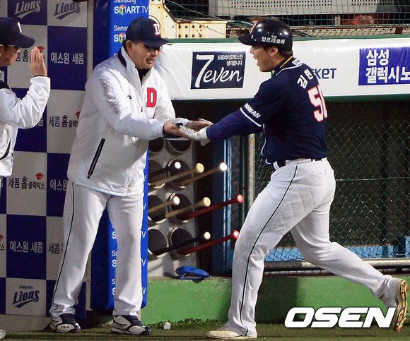 24일 오후 대구구장에서 열린 '2013 한국야쿠르트 세븐 프로야구' 한국시리즈 1차전 삼성 라이온즈와 두산 베어스의 경기 5회초 1사 김현수가 솔로포를 치고 김진욱 감독과 하이파이브를 하고 있다.