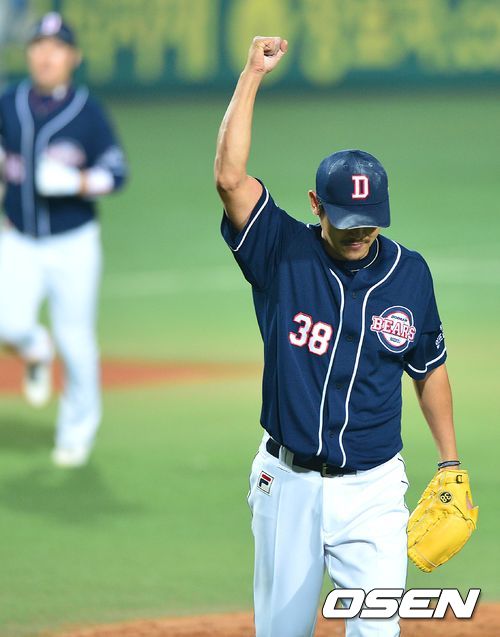 24일 오후 대구구장에서 열린 '2013 한국야쿠르트 세븐 프로야구' 한국시리즈 삼성 라이온즈와 두산 베어스의 1차전, 5회말 삼성 공격 2사 주자없는 상황 9번 정병곤을 외야플라이로 이끌며 무실점으로 이닝을 마친 두산 선발 노경은이 주먹을 불끈 쥐며 환호하고 있다.