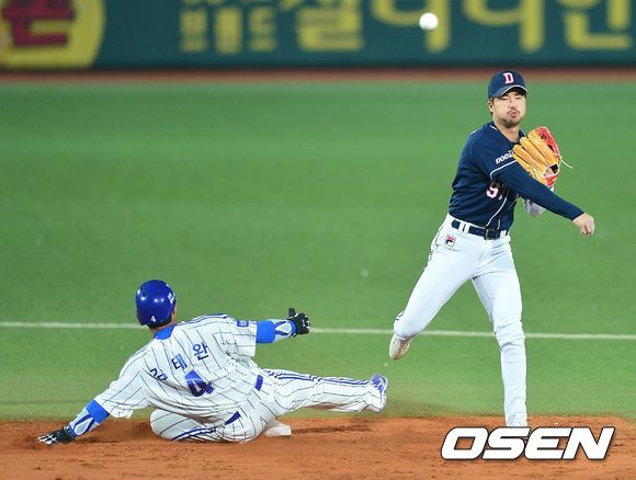24일 오후 대구구장에서 열린 '2013 한국야쿠르트 세븐 프로야구' 한국시리즈 삼성 라이온즈와 두산 베어스의 1차전, 5회말 삼성 공격 무사 1루 상황 대타 진갑용의 내야 땅볼 때 두산 2루수 오재원이 주자 김태완을 포스아웃 시킨 뒤 1루로 공을 뿌리고 있다.