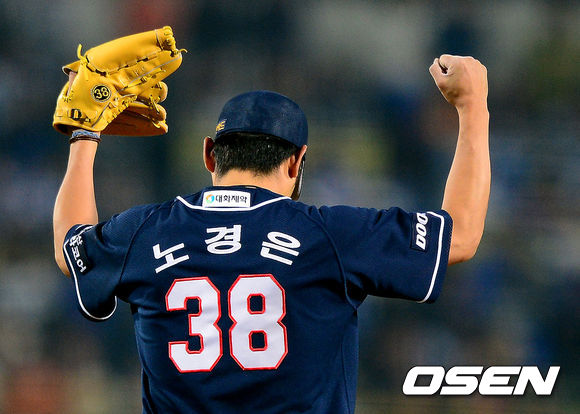 24일 오후 대구구장에서 열린 '2013 한국야쿠르트 세븐 프로야구' 한국시리즈 삼성 라이온즈와 두산 베어스의 1차전, 5회말 무사1루에서 두산 노경은이 삼성 진갑용을 병살로 처리하고 기뻐하고 있다.