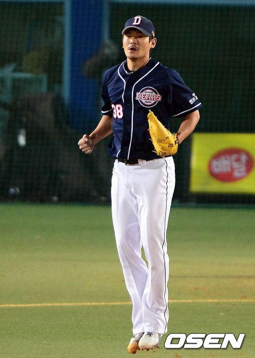 24일 오후 대구구장에서 열린 '2013 한국야쿠르트 세븐 프로야구' 한국시리즈 1차전 삼성 라이온즈와 두산 베어스의 경기 6회말 2사 박석민을 삼진으로 잡은 노경은이 기뻐하고 있다.