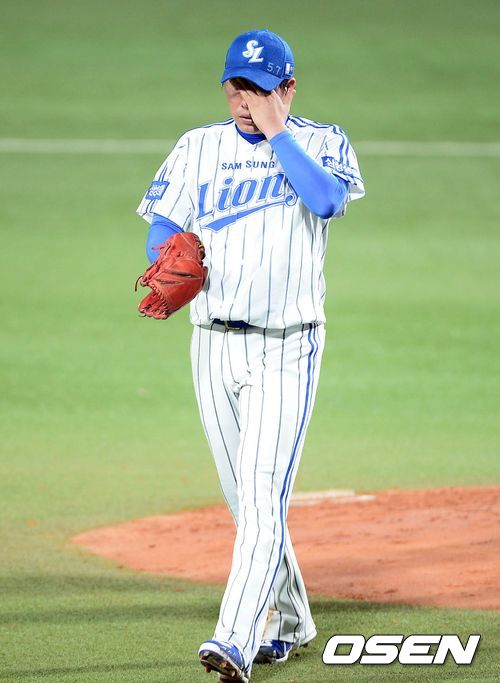 24일 오후 대구구장에서 열리는 '2013 한국야쿠르트 세븐 프로야구' 한국시리즈 삼성 라이온즈와 두산 베어스의 1차전 경기 6회초 두산 손시헌에게 홈런을 맞은 신용운이 마운드를 내려오고 있다.
