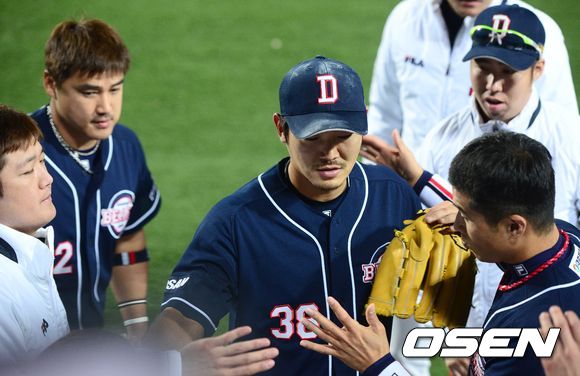 24일 오후 대구구장에서 열린 '2013 한국야쿠르트 세븐 프로야구' 한국시리즈 삼성 라이온즈와 두산 베어스의 1차전, 7회말 삼성 공격 1사 1, 2루 상황 두산 선발 노경은이 마운드를 내려오며 더그아웃 동료들과 인사를 나누고 있다.