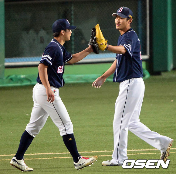 24일 오후 대구구장에서 열린 '2013 한국야쿠르트 세븐 프로야구' 한국시리즈 1차전 삼성 라이온즈와 두산 베어스의 경기 7회말 1사 1,2루 김태완 타석 노경은이 마운드를 내려가면서 변진수와 하이파이브를 하고 있다.