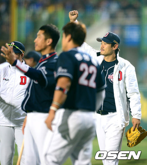 24일 오후 대구구장에서 열린 '2013 한국야쿠르트 세븐 프로야구' 한국시리즈 삼성 라이온즈와 두산 베어스의 1차전, 7회말 1사 1,2루에서 마운드를 내려간 두산 선발 노경은이 교체돼 올라 온 변진수가 삼성 김태완을 병살로 처리하며 수비를 마치자 손을 번쩍 들어 기뻐하고 있다.