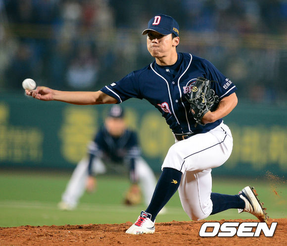 24일 오후 대구구장에서 열린 '2013 한국야쿠르트 세븐 프로야구' 한국시리즈 삼성 라이온즈와 두산 베어스의 1차전, 7회말 1사 1,2루에서 마운드에 오른 두산 변진수가 역투하고 있다.