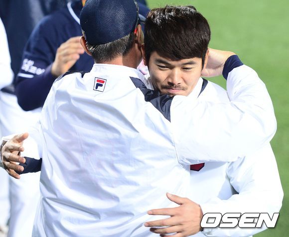 승리투수가 된 두산 노경은이 정명원 코치와 인사를 나누고 있다./dreamer@osen.co.kr