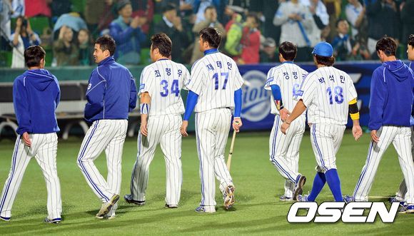 삼성 선수들이 팬들에게 인사한 뒤 그라운드를 나서고 있다./dreamer@osen.co.kr