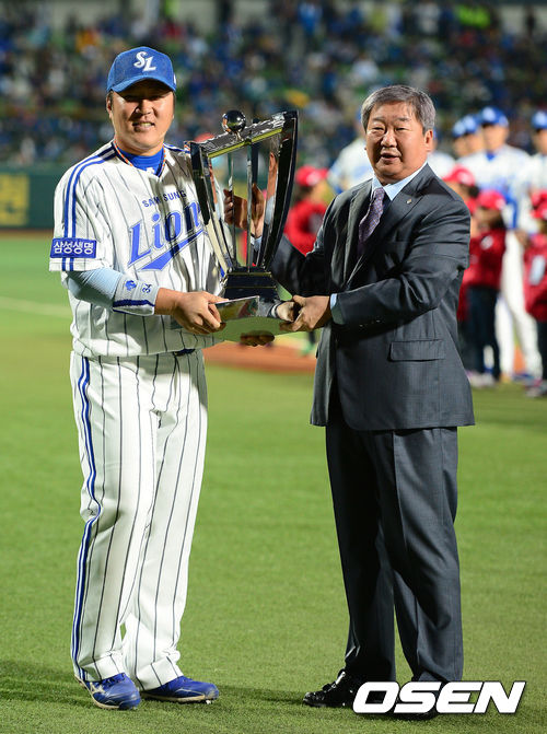 경기전 KBO 구본능 총재가 삼성 최형우에 페넌트레이스 우승 트로피를 건네고 포즈를 취하고 있다./jpnews@osen.co.kr