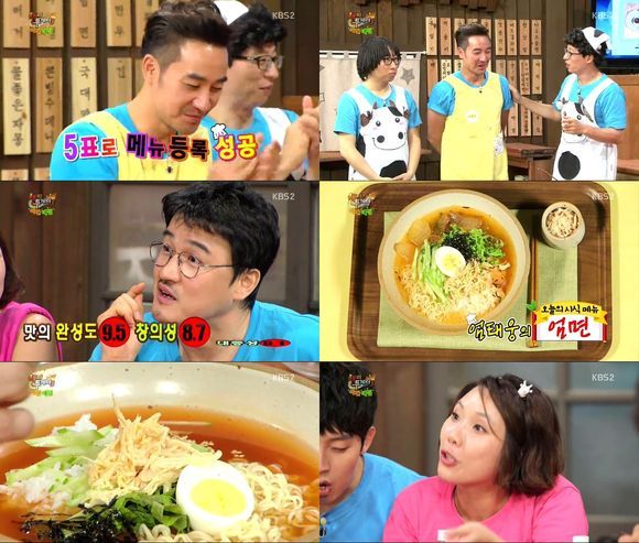 엄태웅은 24일 오후 방송된 KBS 2TV 예능프로그램 '해피투게더'에서 과거 부인의 쉐프 팬이 전해준 냉라면 레시피를 들고 나와 높은 득표수로 야간 매점에 메뉴로 등록했다.