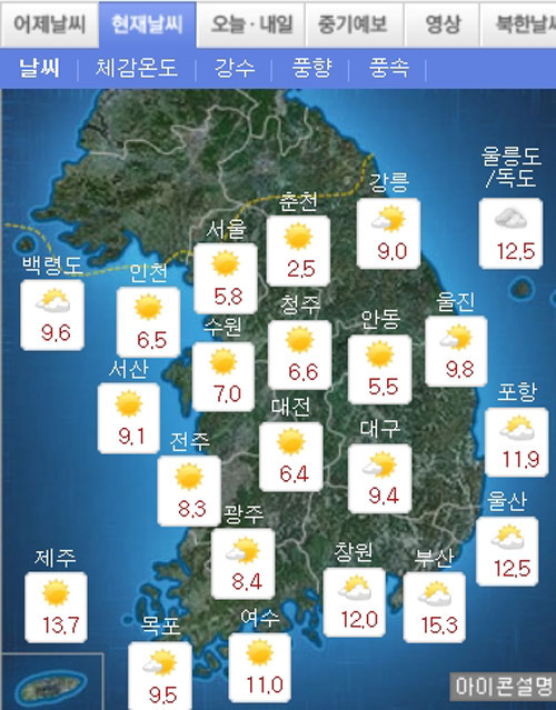 기상청에 따르면 이날 오전 8시 현재 춘천 2.5도, 서울 5.8도, 대전 6.4, 인천 6.5도, 광주 8.4도, 대구 9.4 등 올들어 가장 낮은 기온을 보인 것으로 관측됐다.