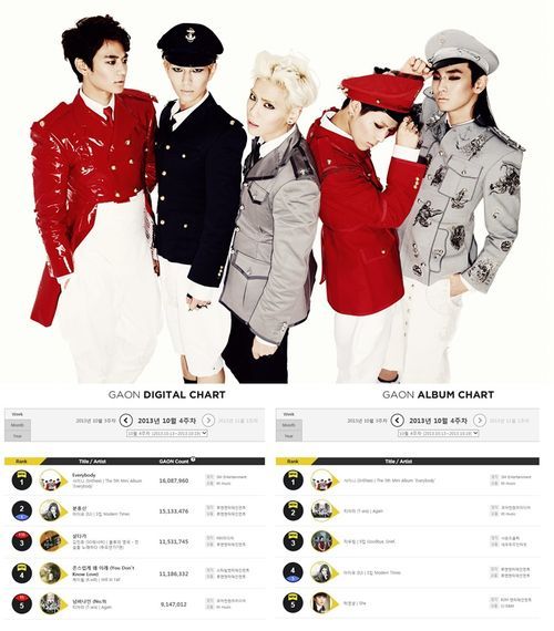 샤이니는 가온차트 10월 4째주(10월13일~10월19일) 주간차트에서 타이틀곡 '에브리바디'로 디지털 종합, 다운로드 부문 1위에 올랐음은 물론 미니앨범 5집 '에브리바디' 역시 앨범 부문 1위를 차지해 인기를 실감케 했다.