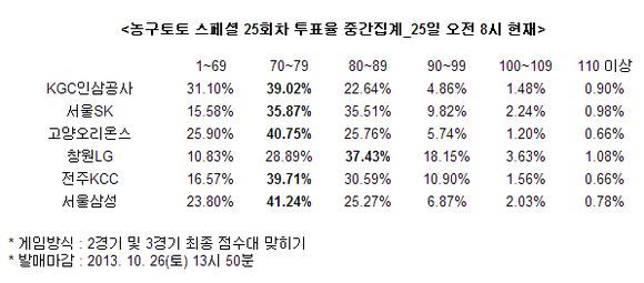 국내 프로농구(KBL) 3경기 대상 농구토토 스페셜 25회차 투표율 중간집계