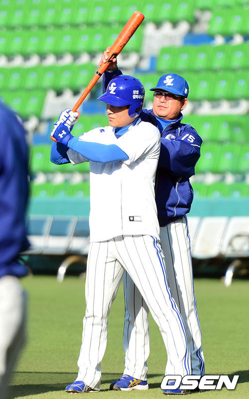 25일 오후 대구구장에서 열리는 '2013 한국야쿠르트 세븐 프로야구' 한국시리즈 2차전 삼성 라이온즈와 두산 베어스의 경기 시작전 류중일 감독이 배영섭에게 타격 자세를 지도하고 있다.
