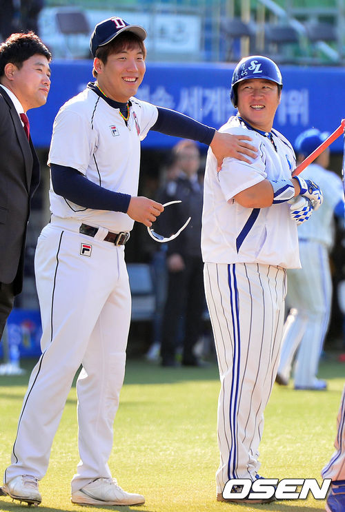 25일 오후 대구구장에서 열리는 '2013 한국야쿠르트 세븐 프로야구' 한국시리즈 2차전 삼성 라이온즈와 두산 베어스의 경기 시작전 김현수와 최형우가 인사를 나누고 있다.