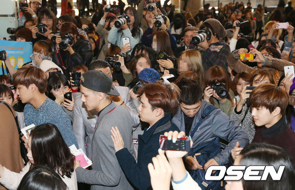 엑소가 출국장을 나설때 수많은 팬들이 엑소를 따르고 있다.