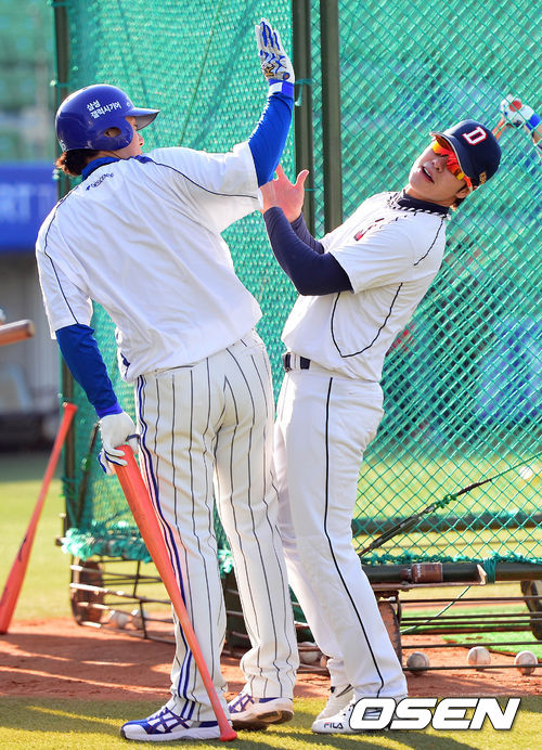 25일 오후 대구구장에서 열리는 '2013 한국야쿠르트 세븐 프로야구' 한국시리즈 2차전 삼성 라이온즈와 두산 베어스의 경기 시작전 이승엽과 민병헌이 장난을 치고 있다.
