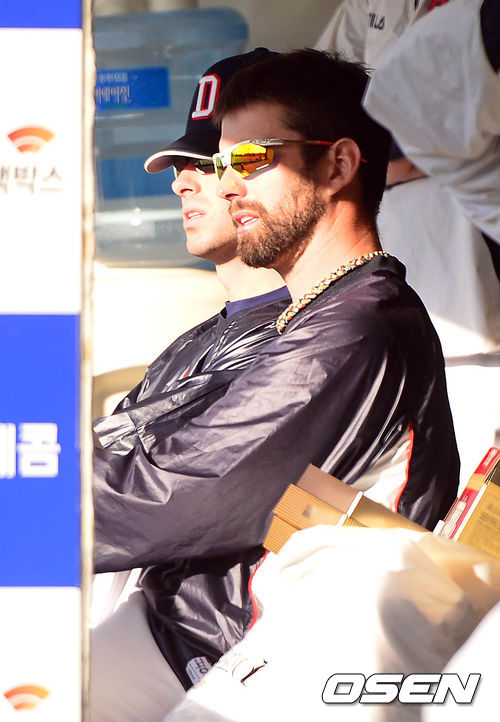 25일 오후 대구구장에서 열리는 '2013 한국야쿠르트 세븐 프로야구' 한국시리즈 2차전 삼성 라이온즈와 두산 베어스의 경기 시작전 니퍼트가 덕아웃에 앉아 있다.