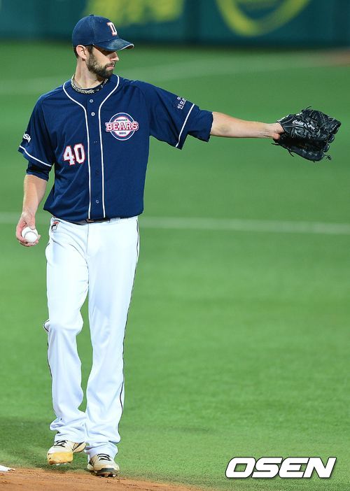 25일 오후 대구구장에서 열린 '2013 한국야쿠르트 세븐 프로야구' 한국시리즈 2차전 삼성 라이온즈와 두산 베어스의 경기, 1회말 삼성 공격 1사 주자없는 상황 2번 정형식의 타구가 2루수 직선타로 처리되자 두산 선발 니퍼트가 인사를 건네고 있다.