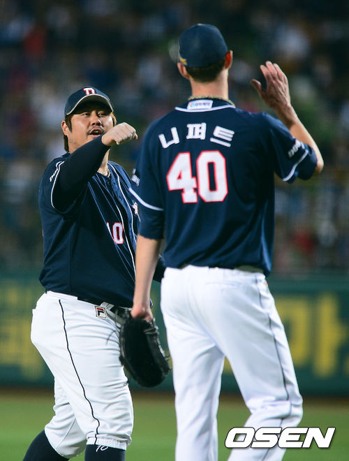 25일 오후 대구구장에서 열린 '2013 한국야쿠르트 세븐 프로야구' 한국시리즈 삼성 라이온즈와 두산 베어스의 2차전, 1회말 2사 1,3루에서 두산 니퍼트가 삼성 채태인을 투수앞땅볼로 처리하고 최준석과 하이파이브를 하고 있다.