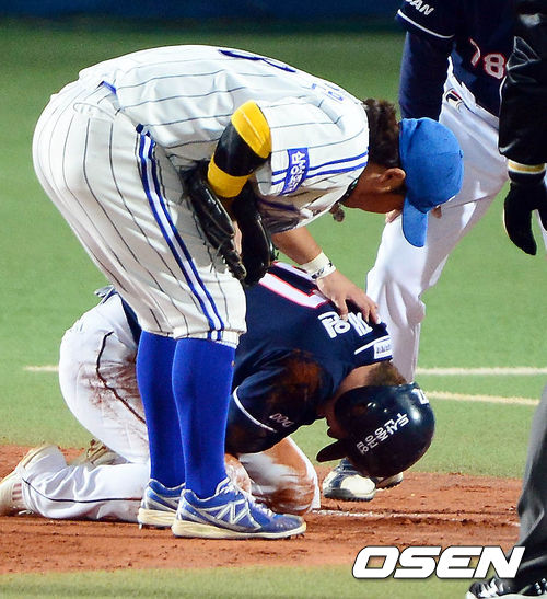 25일 오후 대구구장에서 열린 '2013 한국야쿠르트 세븐 프로야구' 한국시리즈 2차전 삼성 라이온즈와 두산 베어스의 경기 2회초 1사 2루 최재훈 타석, 2루주자 오재원이 도루에 성공하고 고통을 호소하고 있다.