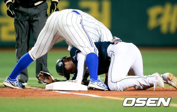 25일 오후 대구구장에서 열린 '2013 한국야쿠르트 세븐 프로야구' 한국시리즈 삼성 라이온즈와 두산 베어스의 2차전, 2회말 1사 2루에서 두산 오재원이 3루 도루에 성공하고 어깨를 만지며 괴로워하고 있다.