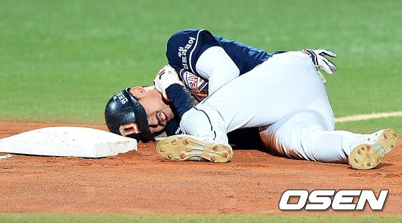 25일 오후 대구구장에서 열린 '2013 한국야쿠르트 세븐 프로야구' 한국시리즈 2차전 삼성 라이온즈와 두산 베어스의 경기, 2회초 두산 공격 1사 주자없는 상황 최재훈 타석 때 2루 주자 오재원이 3루 도루에 성공했다. 슬라이딩 중 삼성 3루수 박석민과 부딪힌 뒤 괴로워하는 오재원.