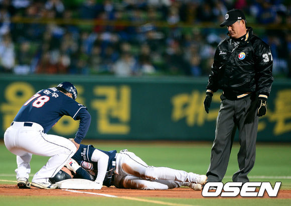 25일 오후 대구구장에서 열린 '2013 한국야쿠르트 세븐 프로야구' 한국시리즈 삼성 라이온즈와 두산 베어스의 2차전, 2회말 1사 2루에서 두산 오재원이 3루 도루에 성공하고 어깨를 만지며 괴로워하고 있다.