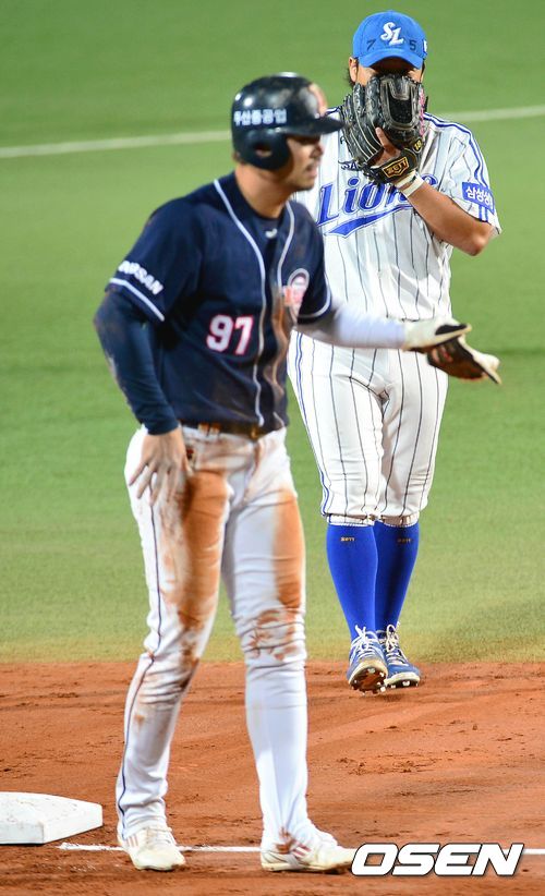 25일 오후 대구구장에서 열리는 '2013 한국야쿠르트 세븐 프로야구' 한국시리즈 2차전 삼성 라이온즈와 두산 베어스의 경기 2회초 1사 2루 오재원이 3루 도루를 시도하다 박석민의 무릎에 쇄골을 받혀 고통스러워 하자 박석민이 말을 건네고 있다.