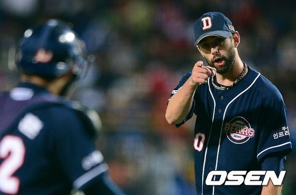 25일 오후 대구구장에서 열린 '2013 한국야쿠르트 세븐 프로야구' 한국시리즈 삼성 라이온즈와 두산 베어스의 2차전, 1회말 수비를 마치고 두산 니퍼트가 최재훈을 격려하고 있다.