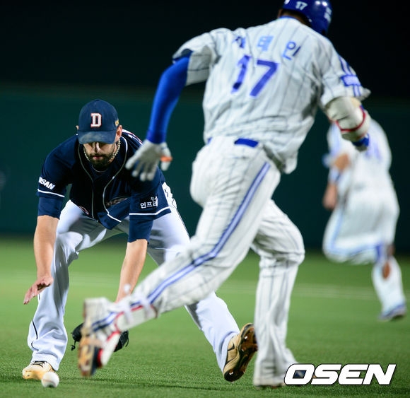 25일 오후 대구구장에서 열린 '2013 한국야쿠르트 세븐 프로야구' 한국시리즈 삼성 라이온즈와 두산 베어스의 2차전, 1회말 1사 1,3루에서 두산 니퍼트가 삼성 채태인의 투수앞 땅볼 타구를 처리하고 있다.