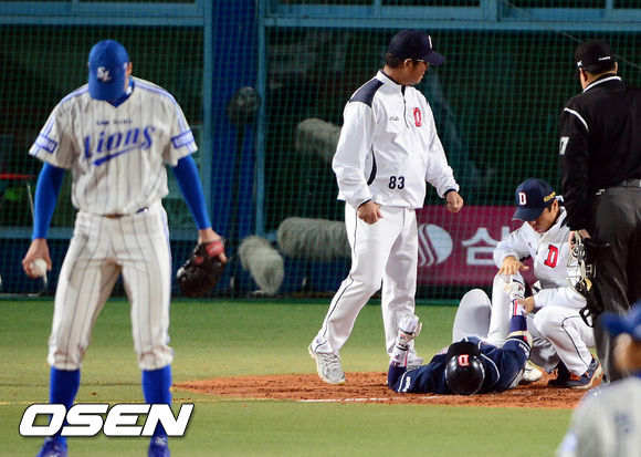25일 오후 대구구장에서 열린 '2013 한국야쿠르트 세븐 프로야구' 한국시리즈 2차전 삼성 라이온즈와 두산 베어스의 경기 3회초 선두타자 이종욱이 밴덴헐크의 투구에 몸을 맞고 타석에 누워 있다.