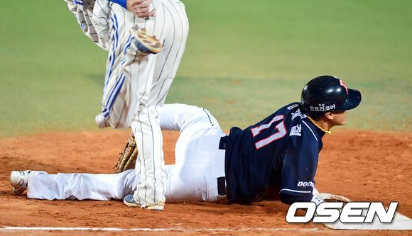 25일 오후 대구구장에서 열린 '2013 한국야쿠르트 세븐 프로야구' 한국시리즈 2차전 삼성 라이온즈와 두산 베어스의 경기, 3회초 두산 공격 1사 1, 3루 상황 최준석의 투수 직선타에 이어 1루 주자 임재철이 태그아웃되고 있다.